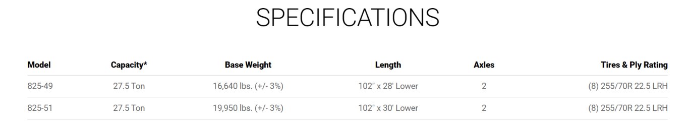 Capacity* 27.5 Ton (55,000 lbs.) Deck Rating 50,000 lbs. in 16′ Estimated Base Weight 16,400 lbs. (49′) 16,950 lbs. (51′) Main Frame Fabricated 10″, 100,000 PSI Flange Deck Width 102″ Loaded Deck Height 17″ Loaded Ground Clearance 7″ Decking 1-1/2″ Apitong, Full Width Crossmembers 5″ x 3″ High Tensile Tubing on 18″ Centers Hitch Automatic Gooseneck Lock Engagement Gooseneck 12′ Pin Setting 15″ Swing Clearance 84″ Side Extension 27″ Aluminum Telescoping Extensions (Lower Deck) (Capacity-7,000 lbs. EACH Extension) Tool Box No Standard Tool Box Gooseneck Tie Downs D-Rings: 2 Each Front Corner; 2 Each Back Lower Deck Tie Downs Double Keyhole Chain Slots Located on 36″ Centers; Side Mounted Nylon Strap / Chain Tie Downs Rear Trunnion Tie Downs D-Rings: 2 Each at Base Flush Mounted on Top of Inner Beams; 2 Each at Rear Flush Mounted on Top of Inner Beams; 2 Each at Top of Slope on Outer Web
