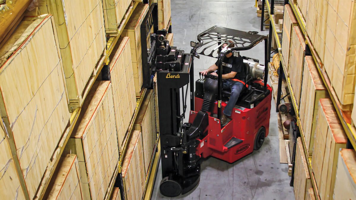 The versatile Bendi B40i5 forklift replaces conventional reach and counterbalanced fork trucks in standard warehouse operations. The unique design allows operators to use it as a counterbalance truck indoors or out, yet operates in narrow aisles in your warehouse, replacing reach trucks that require much wider aisles. The Bendi B40i5 has large diameter tires and the truck has great under clearance for avoiding floor obstructions. One forklift can go from inside the truck to the rack eliminating staging and additional operators and support forklifts. |