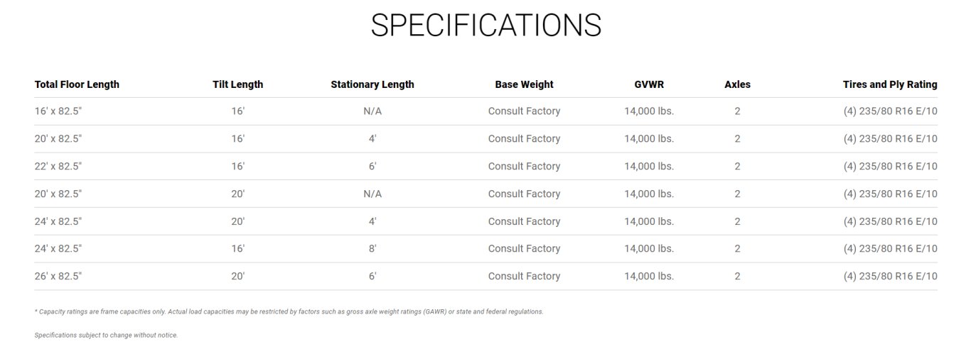 Width 82.5″ Between Fenders 10″ Angle Front Rub Rail Frame: 6″ Channel 7 Prong Heavy Cord with Junction Box Tongue: 6″ Channel Coupler: 2 5/16″ Adjustable Ball Crossmembers: 3″ Channel on 16″ Centers Spring Retraction Dropleg Jack 7000# Torsion Axles with Electric Brakes Dual Lock Single Release Bed Lockdowns Treated Wood Floor